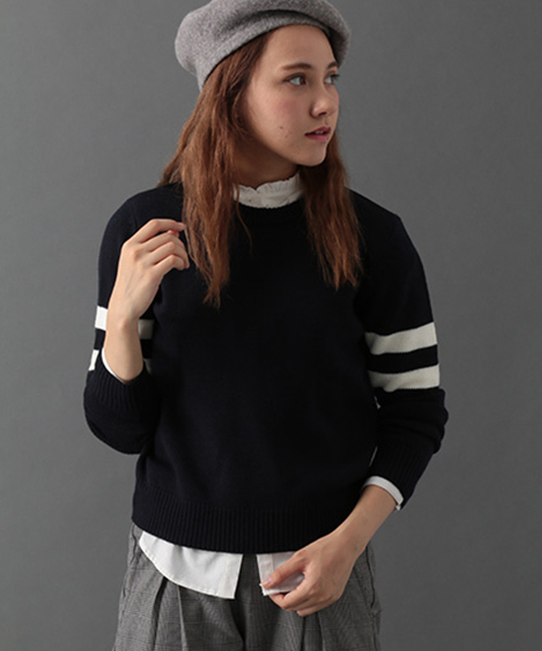 ベーシックなニットの両袖に2本のラインを施しています。飽きノ来ない、長く使っていただけるシンプルなニット。カジュアルにデニムに合わせたスタイリングがおすすめ。インナーシャツを合わせたトラッド風な着こなしも◎。同素材でタートルネック、カーディガンもあります。
