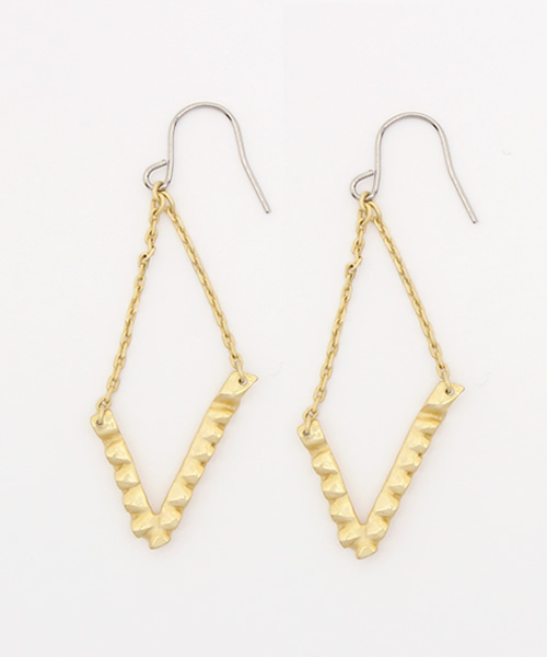 フリルがモチーフ。シルエットをシンプルにすることで、甘くなりすぎずエッジィなデザインに。 V字のフリルが揺れるピアス。左右でシンメトリーなデザインです。 【SCALA(スカラ)】 私たちSCALAは自らが光を放つ女性に身につけてもらいたい という願いを込め、ブランドロゴを太陽にしました。 デザインはもちろんのこと、品質に関しても最良の品質で お客様に身につけてもらいたいと考えております。 そのため、デザイン、原型製作、量産行程、メッキ加工など すべての行程を日本国内で行っております。 SCALAの商品は全て真鍮製です。その上にメッキ加工を施しています。 ヨーロッパでは、真鍮は古くから幸福をもたらす金属として好まれ、 素材の持つ風合いの柔らかさ、光沢も上品で美術工芸品の 素材としても長い歴史があります。真鍮製のアクセサリーはシルバーと同じ製造工程のため、 スズ合金のように簡単な大量生産は出来ませんベースが真鍮製なので経年変化を楽しむことが出来るのも SCALAの魅力の一つと考えています。