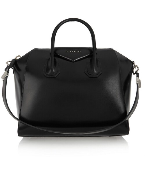 Givenchy Medium Antigona bag in black leather, Givenchy's instantly recognizable 'Antigona' tote is inspired by a classic Boston bag re-imagined with sculpted masculine details. Crafted from glossy black leather and lined in durable tonal canvas, it has room for all your office or weekend necessities plus ample pockets to keep a cell phone, wallet and keys organized Gender: Female. Age Group: Adult.