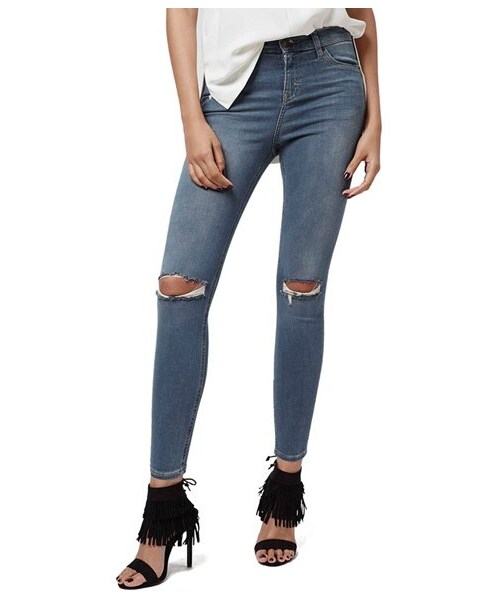 Shredded knees add a bit of extra attitude to high-rise jeans with a super-skinny fit and cropped silhouette. 25" inseam; 9" leg opening; 10" front rise; 13 1/2" back rise (size 30). Zip fly with button closure. Five-pocket style. 92% cotton, 6% polyester, 3% elastane. Machine wash warm, line dry. By Topshop; imported.