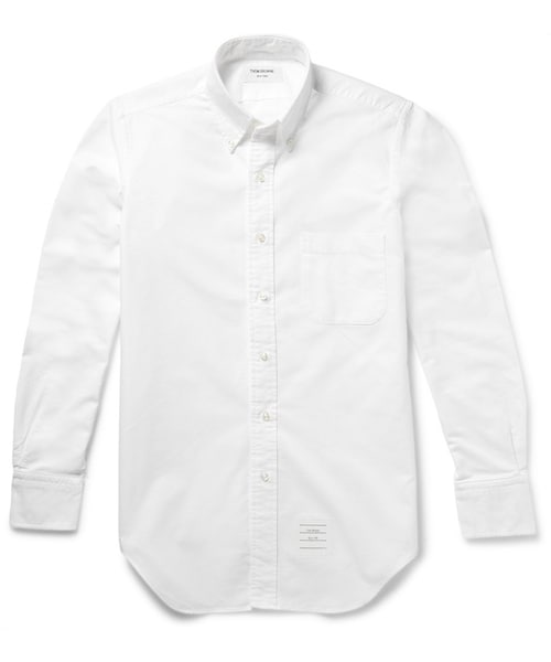 A classic white shirt is the true cornerstone of any sartorially sound wardrobe. Crafted from breathable cotton Oxford, Thom Browne 's slim-fit version is finished with a neat button-down collar. Channel the label's clean-cut aesthetic and team yours with a cardigan and tapered trousers. Shown here with a Thom Browne cardigan , trousers and shoes . White cotton Button-down collar, buttoned cuffs, chest patch pocket, locker loop, reinforced side gussets Button fastenings 100% cotton Machine wash