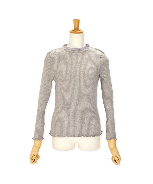 インナーに着て衿元からフリルをちらりと見せるフリルカットソー。 着心地の良い綿100%を使用 太めのピッチに編まれたリブ素材なので柔軟性があり、着やすく動きやすくなっています。程よい厚さの透けない素材なので、一枚で着ても◎ 衿元のさりげないフリルがガーリーなアイテム 程よい透け感のあるシフォンを衿元に使い、細身のシルエットでレイヤードした際に着膨れしません。 袖口と裾のひらひらの仕様がフラワーらしいこだわりポイントで、レイヤードした際、袖や裾からちらりと見せても◎ 秋から春にかけて長期で使える万能アイテムで、色もWhite、Gray、Chacoalの定番のカラーバリエーションで着回し力も抜群です。 ニットやカーディガンのインナーに合わせれば、今年らしいクラシカルな印象に インナーに使用するだけでコーディネートがワンランクアップ。 首が詰まったデザインなので、ニットのチクチクが苦手な方に特におすすめです。 カラー Gray(グレー) Ivory(アイボリー) chacoal(チャコール) Size着丈:66cm 身幅:45cm 袖丈:62cm 肩幅:37cmネック部分:22cm平置きで採寸/※着丈にネック部分は含まれておりません。 素材本体:綿100%衿部分:ポリエステル100%裏地なし生地の伸縮性ありATTENTION※水洗いの場合は極力、手洗いでお願いします。洗濯機で洗う場合は必ずクリーニングネットを使用し、弱流で洗ってください。 ※漂白剤及び漂白剤入りの洗濯剤のご使用はお避け下さい。 ※デリケートな生地を使用しており、引っかけ・引っかかりやすい性質となっておりますので着脱時、またアクセサリーやベルト、周囲の壁など表面の粗いものとの摩擦や引っかかりにご注意くださいませ。※タンブラー乾燥はお避け下さい。