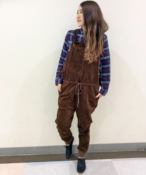 裾リブ仕様で足元すっきりのコーデュロイサロペット。結んで調節できる肩紐は、結び目がリボンのようなアクセントに。さらにウエストもドローストリングで調整可能です。インナーにはシャツ+ニットやハイネックのトップスなど、合わせるアイテム次第で自在に楽しめます。