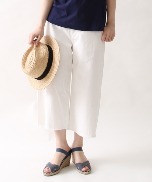 ストンと落ちるワイドラインがトレンドをキャッチアップするパンツ♪余裕たっぷりのワイドラインが今年らしいガウチョパンツ。ドライタッチなデニム地が素肌に心地良い1本です。カットオフで仕上げたウエスト&裾がラフなヌケ感をプラス♪裾足首が覗くクロップド丈が軽やかな印象です。さり気なくプラスされたウエストリボンがレディなアクセント!バックゴムウエストでリラックスして履きこなせるアイテムです。※実店舗と発売時期が異なることがございます。店舗にお問い合わせの際は、全国のコーエン各店まで下記の品番をお申し付け下さい。品名:G DNM ガウチョ 8S PT 品番:7640-610-6007