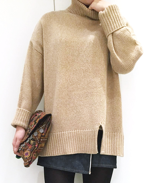 オーバーサイズのタートルニット。 裾リブの前後に入ったスリットが特徴的でスタイリングのポイントになります。 トレンドのワイドボトムはもちろん、ミニボトムやスキニーパンツとも合わせていただけます。
