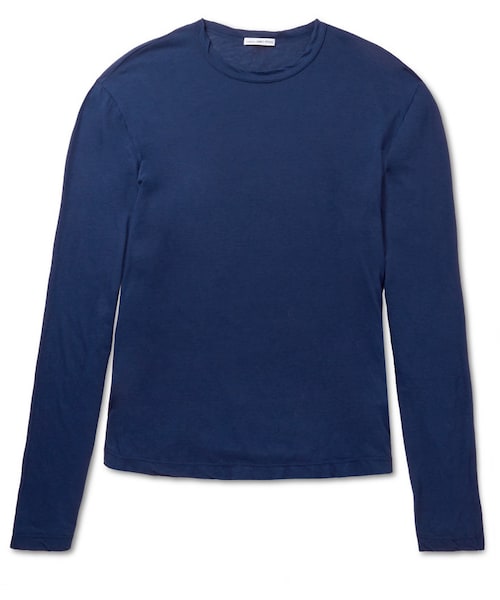 Renowned for their laid-back Californian cool, James Perse 's signature staples will form a firm foundation to your casual wardrobe. This navy T-shirt is designed with a rounded shirt-tail hem, giving it a relaxed drape. It's cut from soft, fluid cotton-jersey that feels breathable and comfy. The long-sleeved shape makes it an ideal layering piece during cooler months, too. Shown here with a Steven Alan sweatshirt , Ovadia & Sons trousers and adidas Originals sneakers . Navy cotton-jersey Crew neck, round hem 100% cotton Machine wash Made in the USA Navy cotton-jersey Crew neck, round hem 100% cotton Machine wash Made in the USA
