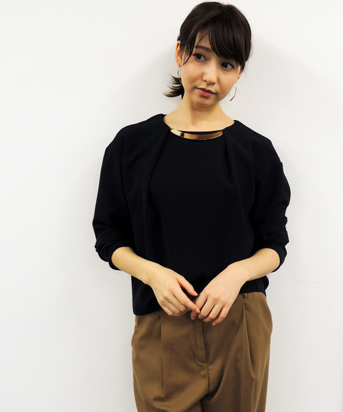 プレートネックレスがセットになったブラウス!シックなプレートタイプで、品があり甘すぎないディティールで、ON・OFFに取り入れやすい1枚。大きなタックや長さの違う裾、緩やかなフォルムで、女性らしいヌケポイントも着こなしにトレンド感をプラスします。※ネックレス取り外し可