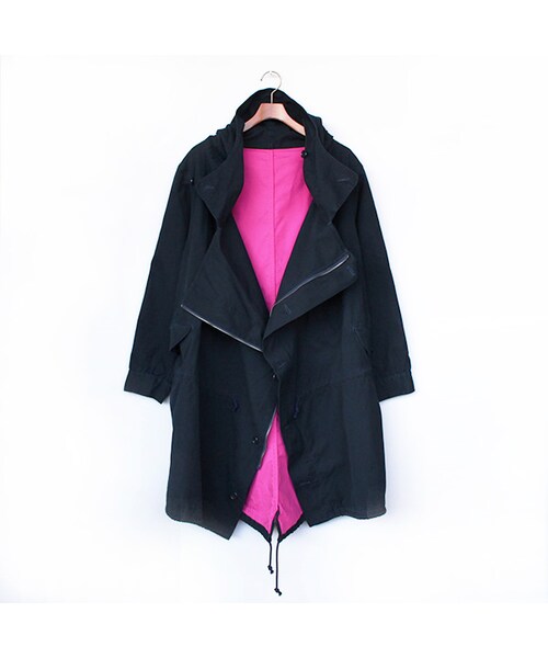 前身頃のみ生地を大きくとり、ワイドシルエットとはまた一味違う独特のシルエットを落とし込んだブランドならではの解釈で作り上げられたモッズコート。フロントを開けて着用すれば、大きな前身頃の生地がドレープとなって表れ、シルエットだけでなくデザインとしても印象的な表情を楽しませてくれます。デザイナー曰く、大きな前身頃は子供を抱っこしたまま着用できたり、大切な人を包みこめたりなどの楽しみもあるとのこと。マットな質感の厚手のコットン生地を使用し、身頃裏地には配色となるビビッドカラーが落とし込まれています。フロントはボタンとジップの2WAYによる開閉が可能で、ジップはダブルジップ仕様なので、着こなしの幅を広げてくれる逸品。フロント比翼の上部分はボタンで締めることができるので、従来のモッズコートに近いシルエットももちろん楽しめます。ウエスト、裾にはそれぞれシルエットを調整できるドローコードが搭載されているなど、機能性も申し分のない完成度の光る一枚です。