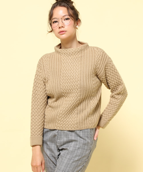 ふんわり素材のリブとケーブルニットのボトルネックデザインが優しい印象を与えるプルオーバー。厚手素材で防寒効果バツグン。家でのリラックス着にも、近所お出かけの時にも♪