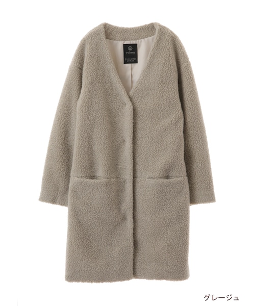 温かみのあるボアで、もこもことした生地感が可愛いコート。総裏地付きになり保温効果もあります。Vネックですっきりとした印象になり、トレンドのタートルネックトップスなどで首もとのオシャレをお楽しみいただけます。ドロップショルダーで女性らしいシルエットに。コートの開閉はスナップボタンになっており、ポケットも付いていて実用性も◎。
