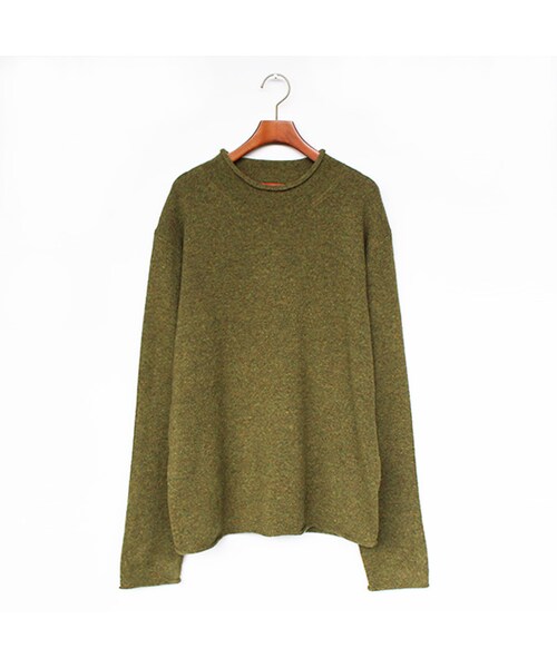 シンプルなデザインでプレーンな印象に仕上げられたウールニット。特筆すべきはその色合い。グリーンとイエローの中間のような、はたまたオリーブともとれる絶妙なカラーリングが魅力の逸品です。首元にはミドルネックを搭載し、その先端はロールアップされたようなデザインに。さりげなくも細やかなデザイナーのこだわりが、程よく全体のアクセントとなり控えめながらも個性を主張してくれます。比較的ジャストなサイジングながら、少したるませたりロールアップしたりと色々な着こなしを楽しませてくれる長めの袖丈を搭載。トレンドをも踏襲した絶妙なシルエットは、着用時にその本領を発揮してくれます。もちろん女性にもおすすめです。モデル身長:173cm 着用サイズ:One