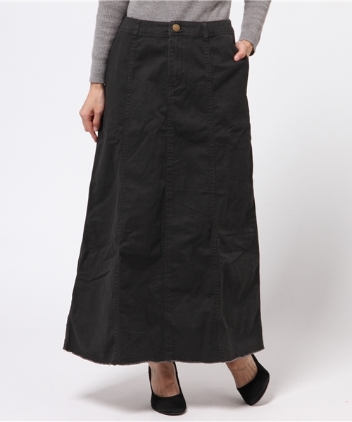 しっかりとした厚手のツイル生地を使用したマキシ丈スカート。前後に入ったパネル切り替えが縦にスッキリとしたラインを作り上げています。裾は裁ち切り仕様で、ほつれた少し生地にダメージ感のあるデザインに仕上がっています。マキシ丈スカートは今の時期寒さ対策としてもバッチリなアイテムです。