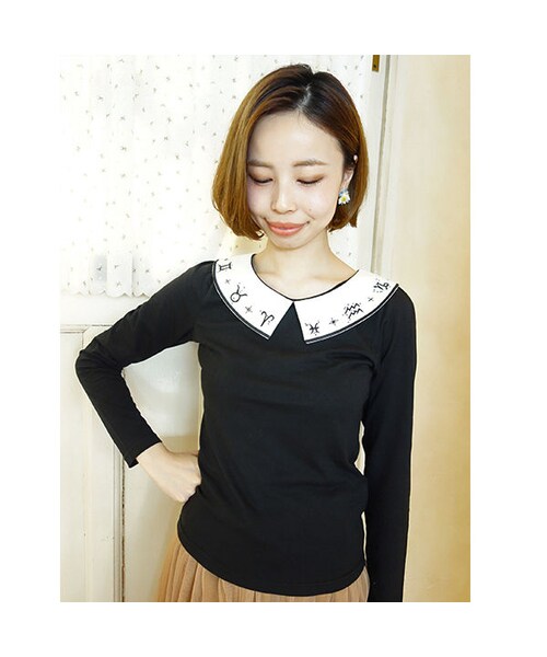 ホロスコープ(星座)の刺繍がロマンティックなカットソー。 特徴のある衿の形がレトロムード漂うポイントです しなやかなレーヨン入り天竺を使用しており、 程よくフィットするシンプルなシルエットは合わせやすさ抜群◎ 一枚ではもちろん、カーディガンやワンピースとレイヤードして衿を可愛くアピールするのもおすすめです♪ MATERIAL:本体 コットン60%レーヨン40% 別布 ポリエステル80%コットン20% モデル身長:158cm made in China サイズ着丈胸囲肩幅袖丈 F58cm80cm32cm58cm
