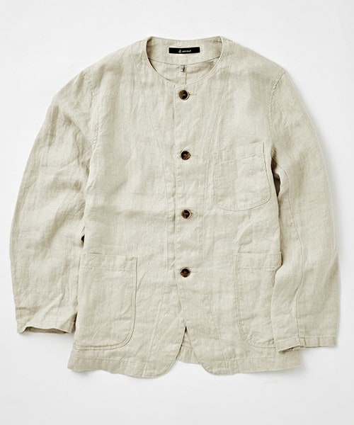 【2016 Johnbull NEW COLLECTION】 リネン素材を使用したノーカラージャケットです。 同素材のワイドパンツ(ブランド品番:21007)とセットアップで着ていただけます。貼りポケットやステッチにワークウェアのテイストを盛り込みながら、首回りをすっきりさせたトレンド感のあるノーカラーデザインに仕上げています。Tシャツやシャツなどとレイヤードしやすく、リラックス感のあるスタイルを作っていただけます。