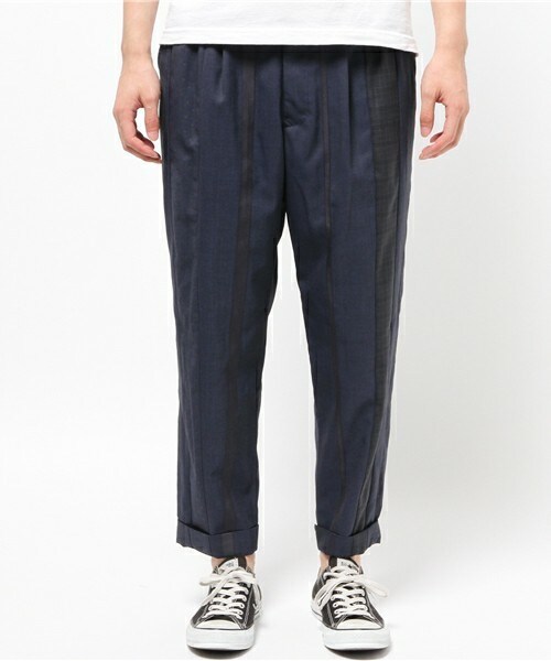 FRAPBOIS 2015-16 AUTUMN/WINTER COLLECTION 毛(ウール)/ポリエステルのムジとチェック柄のスーツ素材をストライプ状に切替えてランダムなパッチワーク風のキレイ目リラックスパンツを作りました。 さりげなくプリントされたドット柄や色のトーンを変える事で色に深みを出しています。