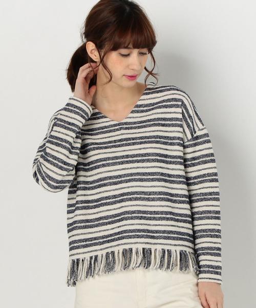 ボーダーフリンジトップス☆サラッと着られるナチュラルな風合いのトップスは、裾に加えたたっぷりのフリンジがポイント。また、ドロップショルダーにVネックを取り入れたトレンド感のある一枚に仕上げました。ゆるめのシルエットながらも短めの着丈なのでルーズになり過ぎずにコンパクトに着こなしていただけます。パンツやデニムスカートを合わせたカジュアルなスタイルがオススメです。※着用、お取り扱いの際は商品についておりますアテンションタグ、洗濯ネームを必ずご確認ください。店舗にお問い合わせの際は、全国のAnother Edition店舗まで下記の品名/品番をお申し付け下さい。品名:AEBC C/BORDフリンジ品番:56121991900