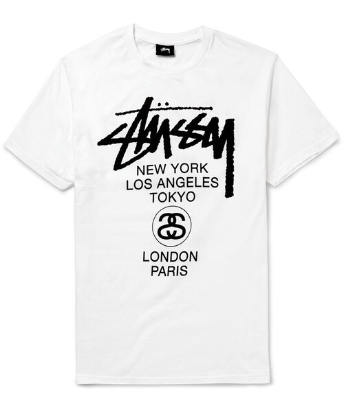 In 1989, Stüssy created its 'World Tour' motif, kick-starting an enduring concept in graphic print design. The front of this cotton-jersey T-shirt is detailed with Helvetica type referencing New York, Los Angeles, Tokyo, London and Paris - all cities considered to be style capitals of the world. The back is emblazoned with graffiti-like lettering calling out Bronx, Compton, Santa Ana, Brooklyn and Venice; areas where the label's street-style thrived. Shown here with a Cav Empt shirt , A.P.C. jeans , Vans sneakers and a Porter-Yoshida & Co backpack . Fits true to size. Take your normal size This T-shirt is designed for a regular cut Model wears a M Model measures: chest 38"/ 96cm, height 6'1"/ 185cm White and black cotton-jersey Crew neck 100% cotton Machine wash