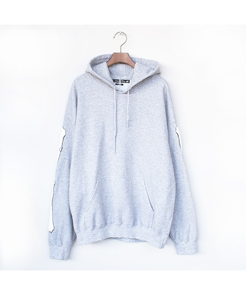 「デザイナーがそのとき着たい服、作りたい服」というコンセプトのもと不定期で展開される【haguremono】のラインから、柔らかい裏起毛のスウェットパーカーを、極限にまでダメージ加工を施し、さらにはボディー全体に毛玉加工を与えヴィンテージのような表情を表現した渾身のアイテムが登場。最大の特徴は、80'sのスケートカルチャーを感じさせる、発泡プリントによる‘骨’のデザイン。あえて骨折を表現したデザインが、ユニークかつインパクトのある表情に仕上がっています。身幅と袖幅(腕周り)がワイドにとられ、着丈は短めという独特のシルエットにも彼らが得意とするサブカルチャーの匂いを感じます。メンズモデル身長:179cm 着用サイズ:L