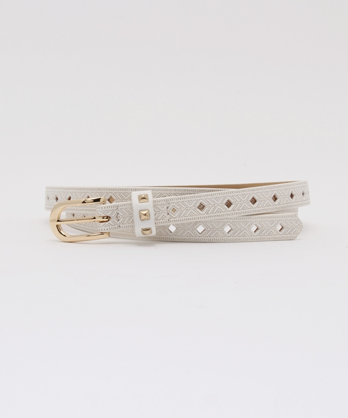 スタイリングのアクセントに目を引くデザインの細ベルト。箔プリントに柄デザインをプラスして、よりスタイリングのアクセントになる1点に仕上がっております。パンツ合わせにはもちろん、ストールやワンピースのウエストマークとしても使えるアイテムです。