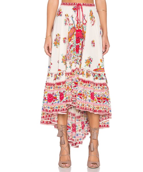 Rayon blend Hand wash cold Unlined Elastic drawstring waist Asymmetric hem Waist to shortest hem measures approx 28" and to longest hem approx 42" in length