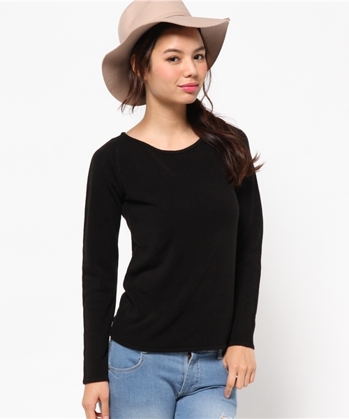 カシミアタッチの着心地の良いニット。シンプルなボートネックの形です。ロンパースのインナーにおススメです。