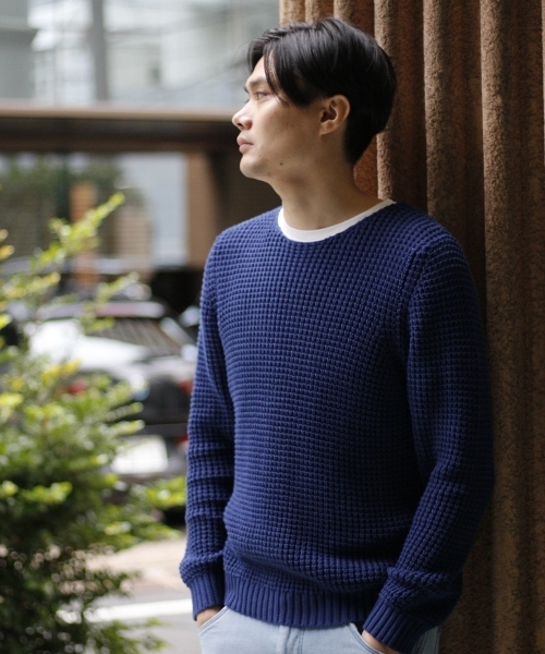 発色の良いイタリア糸を使用したタック編みのクルーネックニット。 コットン素材の柔らかい糸とザックリ凹凸感の相性も良く、サイズバランスの多少ゆとりを出すことでリラックス感あるアイテムに仕上げました。デニムに合わせた春らしいクリーンな着こなしや、スラックスと合わせたシックなスタイルなど幅広く使用して頂けるニットです。※店頭・屋外での撮影画像は、光の当たり具合で色味が違って見える場合があります。商品の色味は、スタジオ撮影の画像をご参照ください。