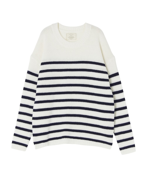 太めの糸で編まれたボーダーニットはスタイリングの定番に。パネルボーダーにする事で、子供っぽくならないのがポイント。カラーは今季の気分に合わせてブルーもオススメ。