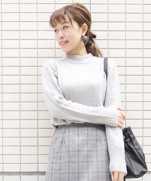 who's who Chico(フーズフーチコ) 細めのケーブル柄が上品な着映えを演出するニットプルオーバーです。 袖口にはゴールドボタンを添え、アクセントにしています。 コンパクトなハイネックで首元も暖か。 ヒップにかかる少し長めの着丈は、ボトムスにインしてもアウトにしてもバランスよく決まります。 #ニット#セーター#ケーブルニット#ケーブル編み#ウール#タートルニット#ハイネック#プルオーバー#