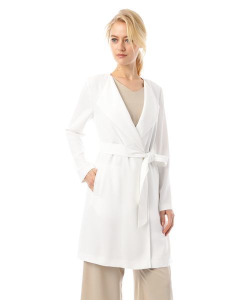 柔らかな光沢となめらかな風合いが特徴のコートです。ドレープ性が高く、ソフトな反発のある風合いと薄手ながら重量感のある素材です。今年らしいボタンレスのラップ型のコートはノーカラーでスッキリと仕上げました。クロップドパンツやガウチョパンツとの相性も抜群です。