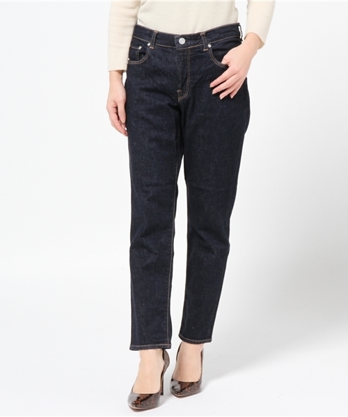 allureville (アルアバイル)D.M.G.[DOMINGO(ドミンゴ)] ジーンズおよびカジュアルウェアを展開するドメスティック・ブランド。1946年創業の老舗で、JAPAN MADEに強いこだわりを持っています。店舗で年間定番として人気の、着まわし力抜群アイテム。絶妙な丈バランスで美脚効果もあります。フロントはジップフライ仕様、すっきりと腰にフィットし、脚のラインにピッタリと沿うタイトなシルエットながら、ストレッチが効いているので動きやすいのが魅力。クリーンな印象のワンウォッシュはこれからの季節に◎。シルエットが美しいので、ヒール靴に合わせてきれいめな着こなしにもおすすめ。流行に左右されず、オールシーズン活躍してくれる定番アイテムです。