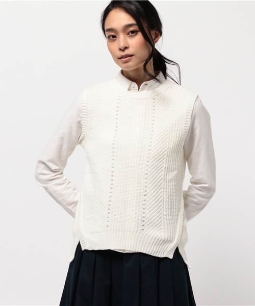 今すぐ使えて春にも着られるトレンドのニットベスト。 斜めになった編地やアイレットなど編地変化が特徴のデザインです。 シルエット全体はゆったりしているから、シャツやカットソーとのレイヤードも窮屈感なくできます。