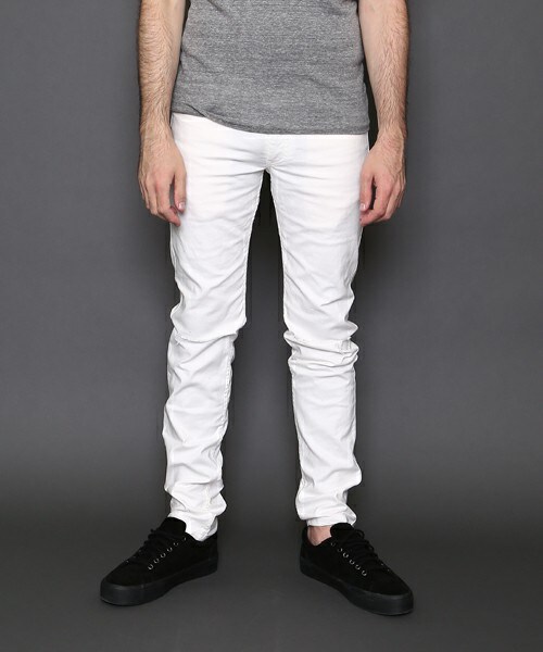 厚手の生地だがストレッチの効いたパンツは穿き心地も○。膝部分にダメージを施したVIRGOらしいデザインに。