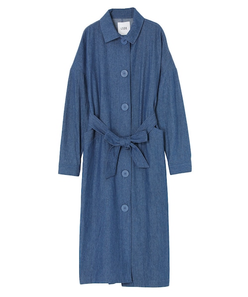 スタンドカラーのデニムチェスタージャケットです。ボタンを開けてウエストの紐で縛ると雰囲気が出て可愛いです。