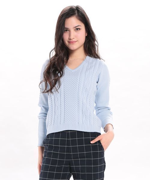 【表情のあるケーブル編みがコーディネートの決め手!さりげなくも存在感のあるベーシックトップスは1枚あると便利。】女性らしいVネックとコンパクトな丈感ですっきりと着こなせるストレッチトップス。表情のあるケーブル編みでデザインが、シンプルながらもさりげなく存在感をアピールしてくれます。カジュアルには持ちろん通勤スタイルにも重宝。アンクルパンツやウエスト高めのボトムでバランスよくコーディネートするのがおすすめです。