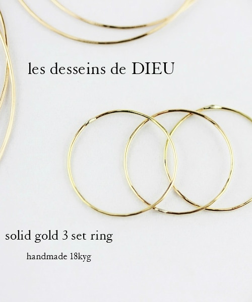 18金の金線から1本1本丁寧に作られた ハンドメイド リング 3本重ねて着ける、 又は1本づつ色々な指に着ける事も出来る3本セットの指輪です。 デザイナー自らが一つ一つハンドメイドで製作するこちらのリングは レデッサンドゥデューの定番の指輪です。 槌目のニュアンスある光り方も魅力です。