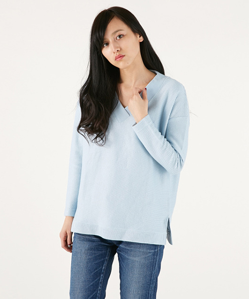 シンプルなVネックトップス。ゆったりめのルーズデザインですがインでもアウトでも着回しのきくアイテム。