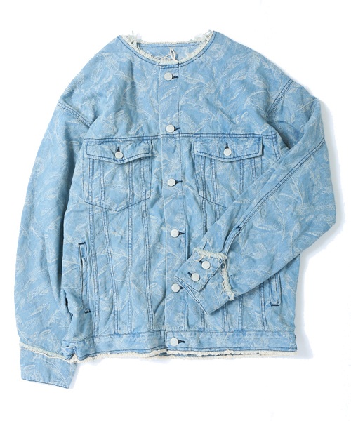 【Iroquois(イロコイ)】ブランドが展開するオーバーサイズデニムジャケットを別注―シルエット・デザイン―・今期も引き続きトレンドのノーカラーブルゾン。・首元・裾・袖・肩は断ち切り。・ボタンは全てブランドネーム入り。・アームホールや身幅はゆるく、ゆったりした着心地。―素材―・綿100%。・柔らかい肌触りの生地感。・これからの時期にぴったりの裏地がない、軽快な羽織です。・得意のジャカードでフェザーがデザインされるこだわりの生地です。