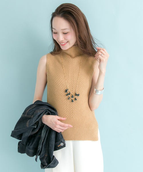 綿素材のリリアン糸を使った畦のニットベスト。 春を意識したソフトな素材感と、程よいボリューム感の畦編みが特徴の一着。 すっきりとした印象のボトルネックが、コーディネートを品よくまとめてくれます。 脇のスリットを深めにしたことで、ボトムスとのバランスがとりやすく着回し力も◎ シャツやカットソー合わせはもちろん、デニムジャケット等と合わせて一枚でもお召しいただけます。 今年、抑えておきたい注目アイテムです。