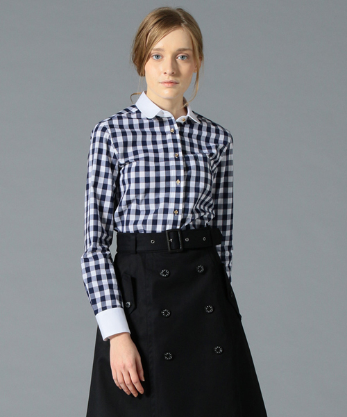 GISELe 3月号 135ページ 掲載アイテム 大柄のギンガムチェックが春夏らしい、爽やかなクレリックシャツ。 ラウンドカラーのデザインが、女性らしくやさしい印象を与えてくれます。 クレリックタイプなので、コーディネートしやすく、ジャケットなどのインナーにも最適。 ネイビー×ホワイトの配色にピンクのラインが入っており、いわゆるギンガムチェックとは差別化された、特別感のある一着です。