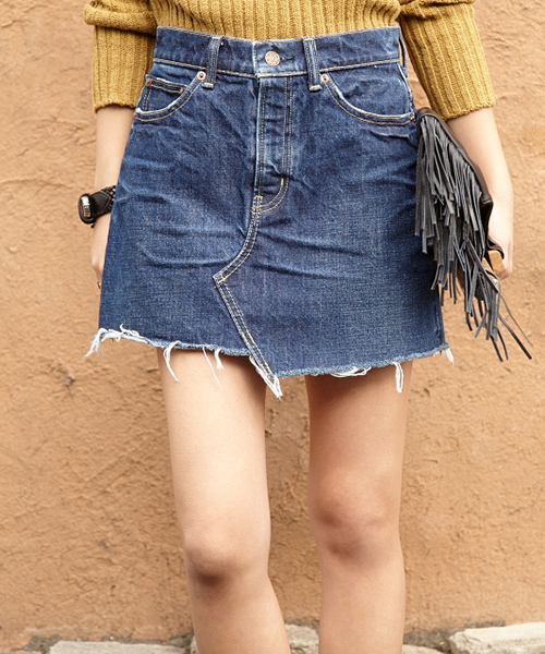 裾はあえて傾斜をつけてカットし、リメイクデニムのような雰囲気を出したミニスカート。裾ももちろんカットオフしています。やりすぎていない加工感にすることで長く愛用していただけるデニムに仕上げました♪