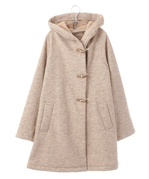 裏地をボア仕立てになったフードコートです。とっても暖かく、丈も長いので、防寒性はバッチリ!ほんのりAラインのシルエットがかわいらしい印象に。木製のトグルを使い、ダッフルコートのような雰囲気になっています。パンツにもスカートにも合わせやすい、使い回しの良いアウターです。