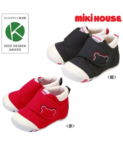 キッズデザイン賞受賞したミキハウスのファーストシューズです☆よちよち、あんよを始めた頃からの赤ちゃんの正しい歩行をしっかりとサポートするベビーシューズです。つま先が少しあがっているので、歩き始めの赤ちゃんも歩きやすくファーストシューズとして、たっちやあんよの練習にお使いいただけます。 面ファスナーで甲ベルトが開いて、履かせやすくなっています。面ファスナーで調節できるので、甲高の赤ちゃんの足にもフィットします。 底が全面ラバーなので、室内だけでなく、お外歩きにも使っていただけます。赤ちゃんの成長は早いもの。3ヶ月程度を目安にこまめに足のサイズを測ることを心がけ常に最適なサイズの靴を選んであげてくださいね。※面ファスナーとは、マジックテープのことです。(「マジックテープ」は(株)クラレの登録商標です。)