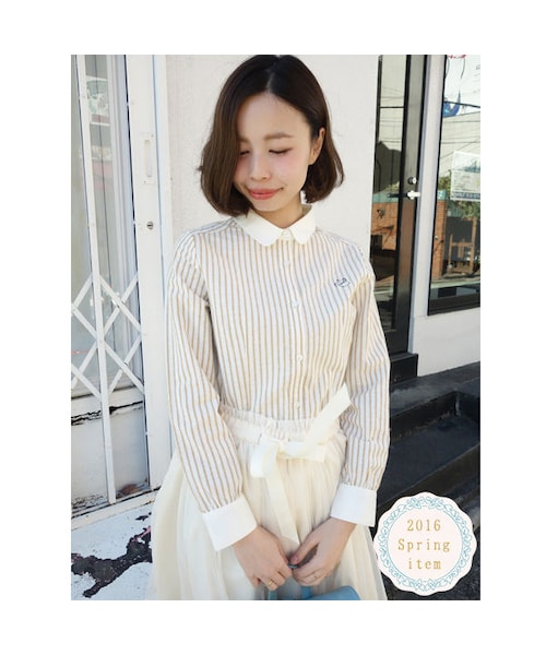 さりげないコーヒーポットの刺繍が衿にあしらわれた一品♡ ベーシックアイテムでありながら、ウエストをシェイプしたシルエットや シャキっとした素材感が上品な印象を与えてくれます。 コンパクトなシルエットは、カーディガンやプルオーバーとの重ね着にぴったりです♪ コーヒーポット刺繍を活かしたカフェの店員さんコーディネートもキュートでオススメです♡ MATERIAL: 無地 ポリエステル80%コットン20% ストライプ 本体 コットン70%レーヨン15%ポリエステル15% 別布 ポリエステル80%コットン20% モデル身長:158cm made in China サイズ着丈胸囲肩幅袖丈 Free60cm92cm36cm57cm