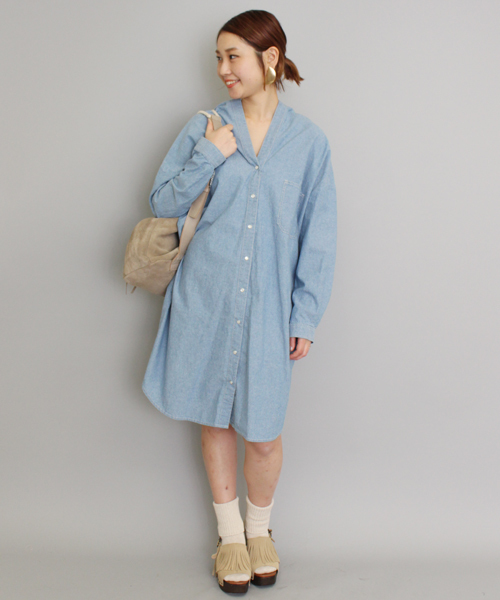 mystic(ミスティック) 程よい柔らかさのダンガリー素材を使用したシャツワンピです♪ 春から初夏の羽織りとしても、1枚でワンピースとしても着れるおすすめアイテム! 前後のVネックデザインがポイントで、バックスタイルも可愛くきまります。