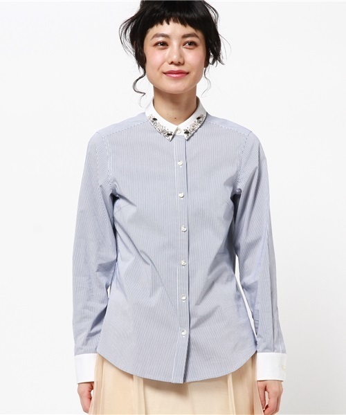 衿先にビジューを散りばめた、重ね着に欠かせないストライプ柄のシャツブラウス。小さめの衿が今年らしく、きちんと感が出るコンパクトなシルエットです。衿と袖カフスは白無地なのでかっこ可愛い印象です。ニットINで着こなして旬なレイヤードスタイルを。51032-512A,75032-512Aと同型素材違いとなっています。洗濯:手洗い・ドライ