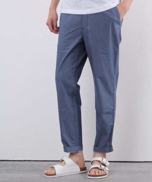 ★吸水速乾機能搭載★ 薄手でさらりとしたドライタッチが特徴のパンツ。さらさらした肌触りで穿き心地も抜群。 さらに吸水速乾機能があり汗をすばやく吸収し早く乾くので春夏にぴったりの一本。そして適度な伸縮性のある素材なので動きやすさも兼ね備えています。 同素材、同色のジャケットとのセットアップスタイルも可能で、春夏のきれい目スタイルやビジカジスタイルにもお使い頂けます。カジュアルなアイテムとの相性もよいので合わせるアイテムによって雰囲気をガラリと変えて着られるのも魅力です。