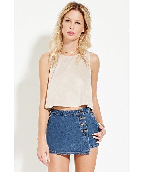 details This denim skort features a buttoned wrap front, slanted front pockets, back patch pockets, and a zip fly closure.