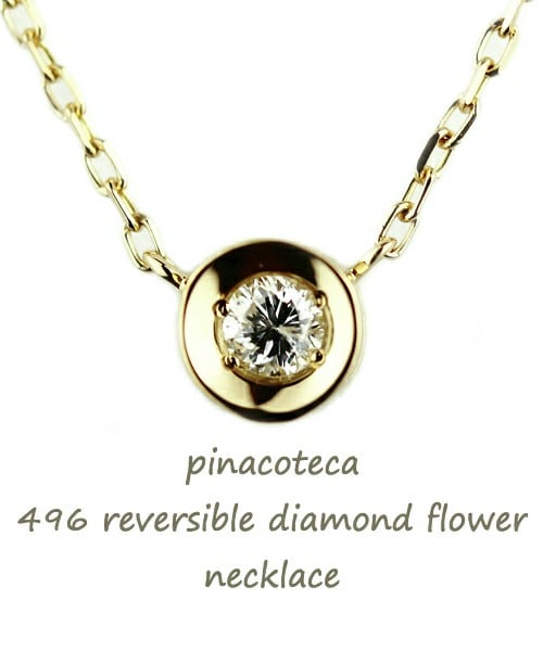 「 Reversible Diamond 」 シンプルな一粒ダイヤの裏には柄の入った透かしが入るシリーズ ダイヤを一回り大きく見せるチョコ留めを使用した一粒ダイヤ ネックレスです。 お花柄のスカシが裏にデザインされています。 定番として、ひとつは持っていたい華奢 一粒ダイヤモンド ネックレスです。 程よい存在感と華奢加減のバランスがよく手放せない存在になりそうです。 18金イエローゴールド製