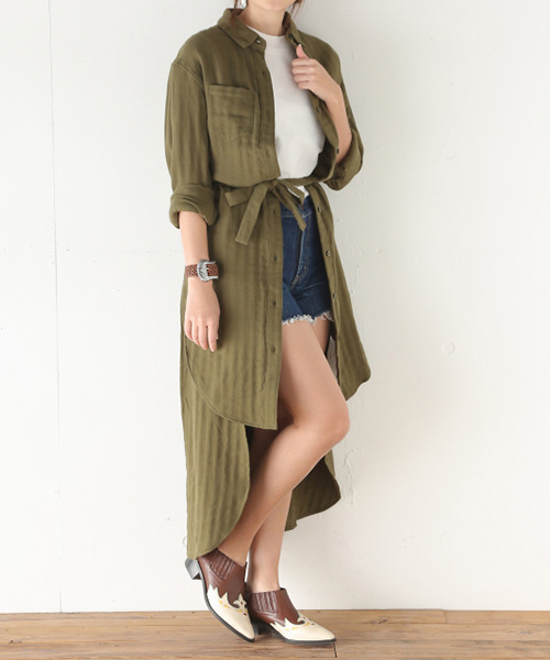 春を感じられるへリンボンの2重ガーゼ素材を使用しました。デニムショートパンツと合わせて、程良い肌感で女性らしくスタイリングするのがおすすめです。羽織としてもデイリーに使い回せるアイテムです。