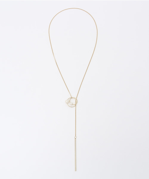 人気のラリエットネックレス。 チェーンを通す部分にパールが付いて上品な印象です。 華奢ですがつけると存在感があり、無地のニットやブラウスなどシンプルなトップスを引き立ててくれます♪ 留め具がなく上から被るタイプなので着脱も楽ちんです。
